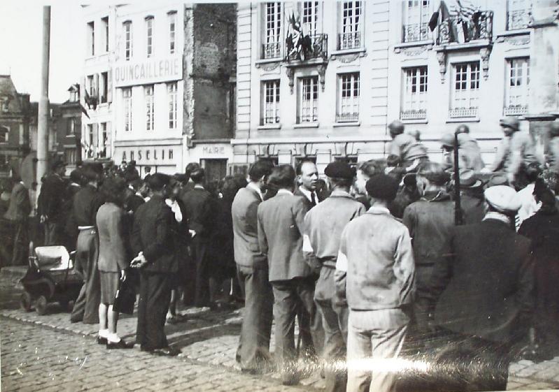 Note : Place de l'hotel de ville face à l'hotel de ville dont la reconstruction n'était pas terminée . La reconstruction de la mairie s'est faite en plusieurs étapes Il y avait 7 ou 8 ou 9 maisons qui furent rachetées au fil des années.